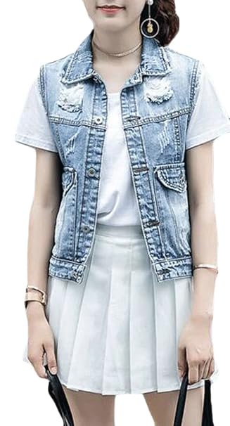 Cromoncent Women Slim All Match Sleeveless Waistcoat Jeans Hole