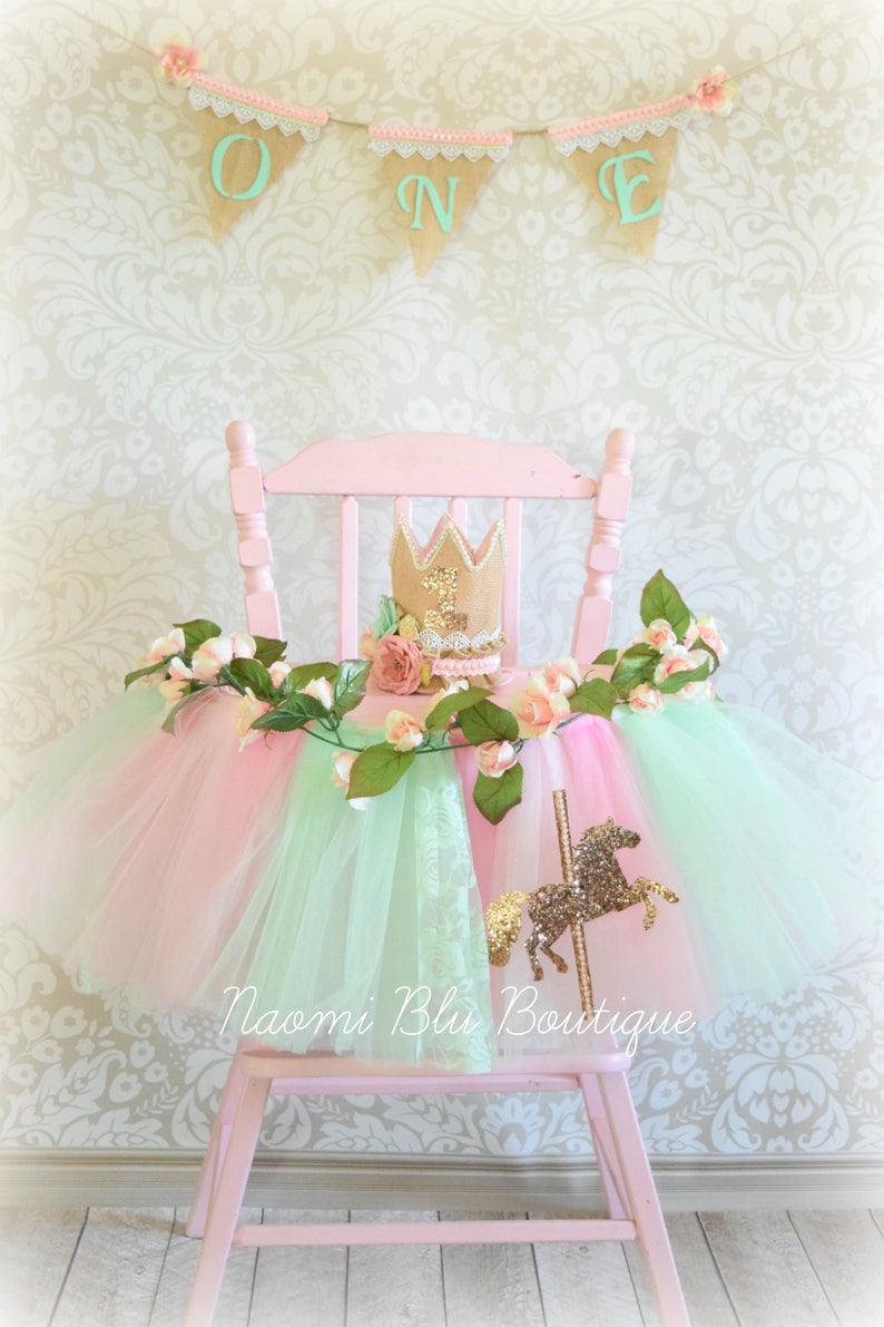 Carousel Vintage Floral Lace Pink Mint High Chair Tutu Birthday Party Decoration Highchair Decoration Cake Smash First 1st