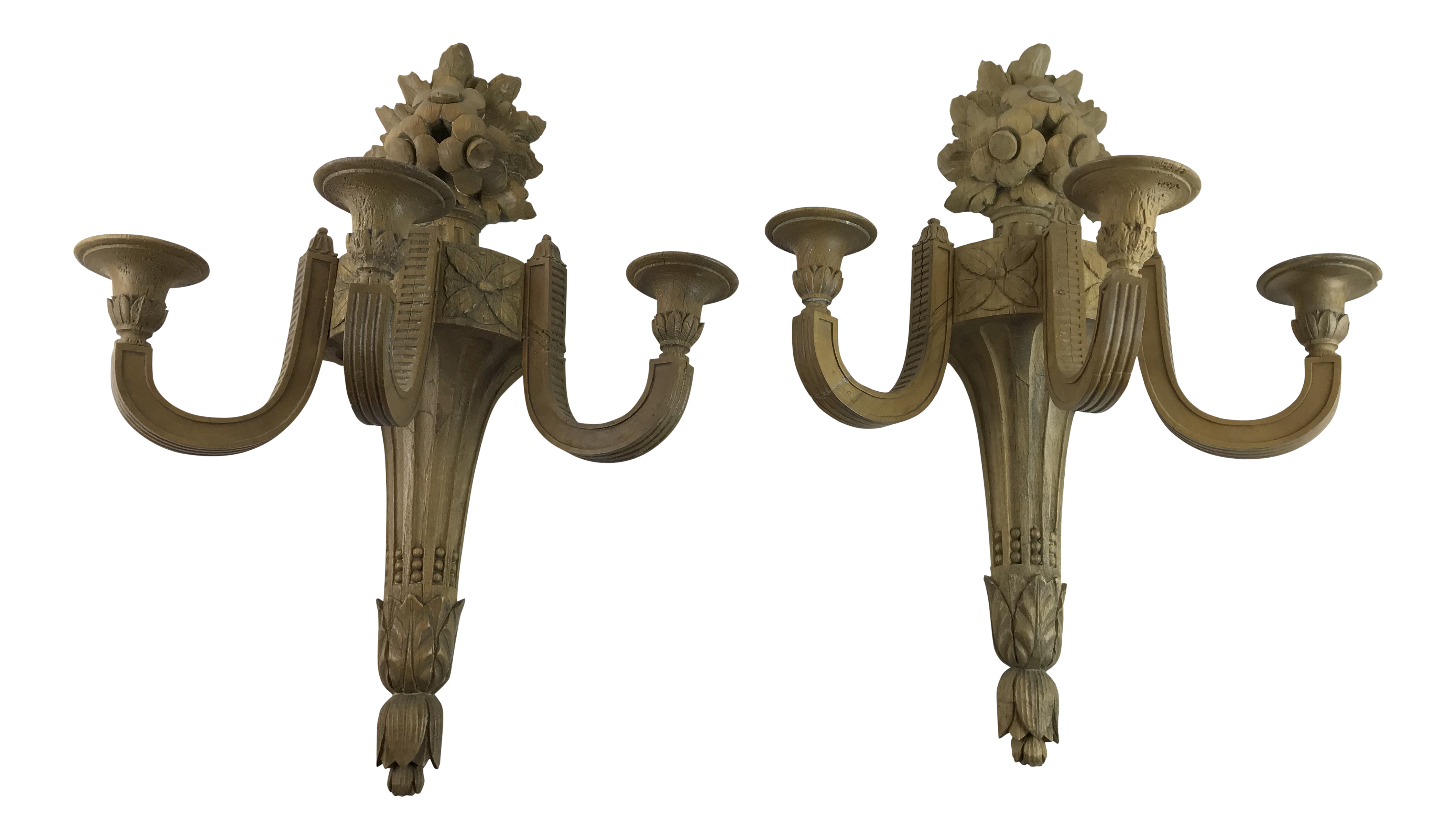 Large Carved Wood Three Arm Wall Candle Sconces With Fruit A Pair