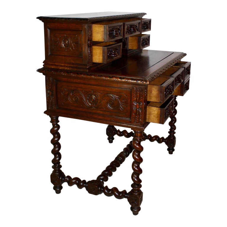 Carved Oak Hunt Desk With Green Man Drawer Pulls Circa 1890