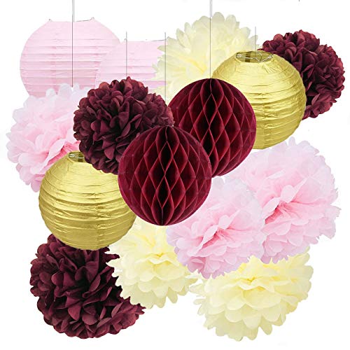 Bridal Shower Decorations Burgundy Pink Cream Glitter Gold Tissue Pom Pom Flower Paper Lanterns Honeycomb Balls Wedding Engagement Party Supplies