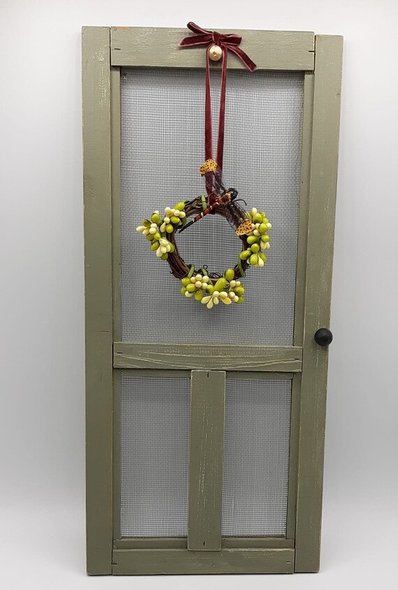 Mini Screen Door Wall Hanging With Flower Wreath Dragon Fly Distressed Handpainted Decorative Screen Door Farmhouse Decor Vintage Screen