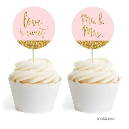 Blush Pink Gold Glitter Print Wedding Round Cupcake Topper Diy Party Favors Kit 20 Pack