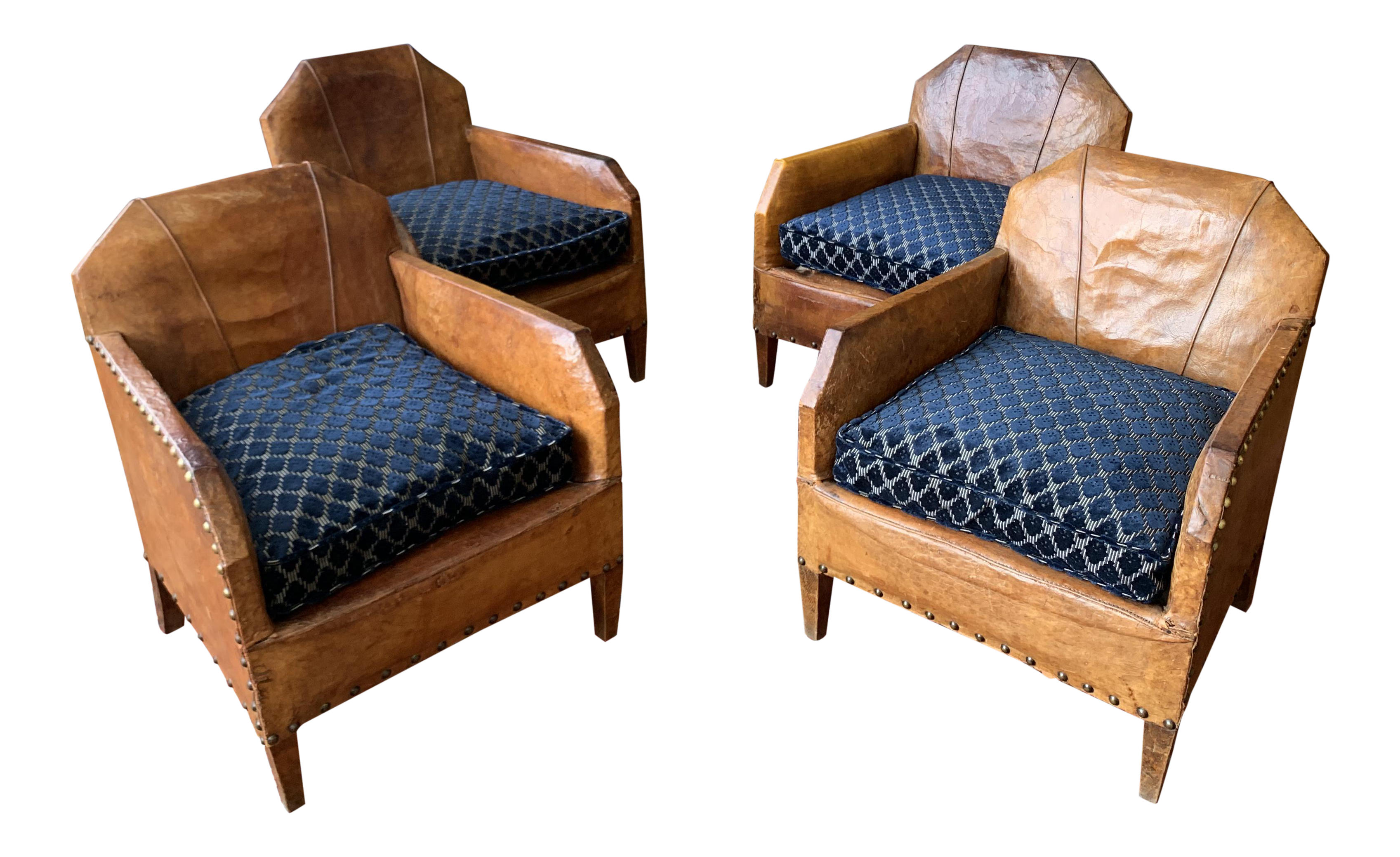 1930 S Art Deco French Leather Club Chairs Set Of 4 Christian Lacroix Cushions