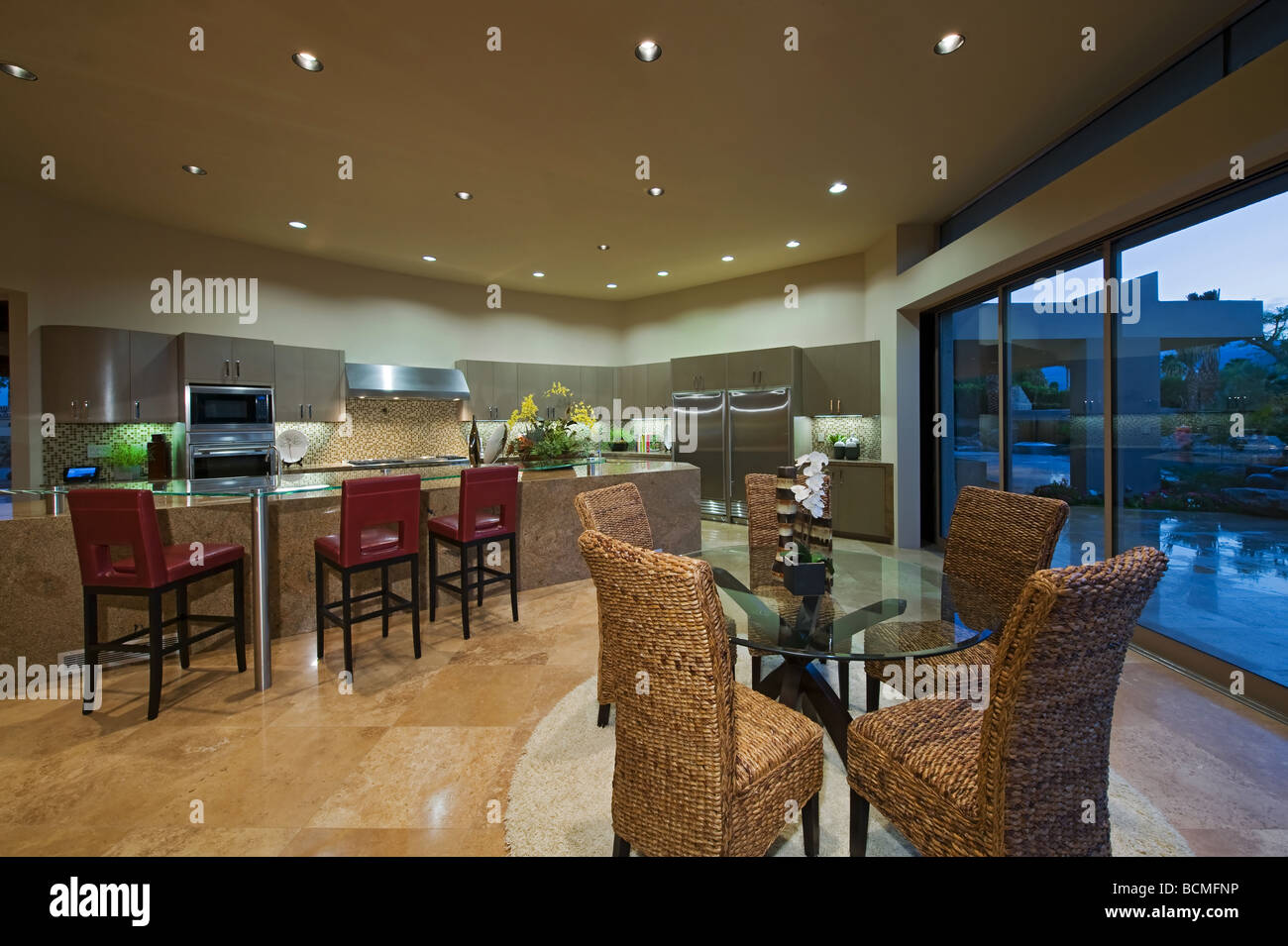 Large Modern Kitchen Area With Red Bar Stools At Island Breakfast