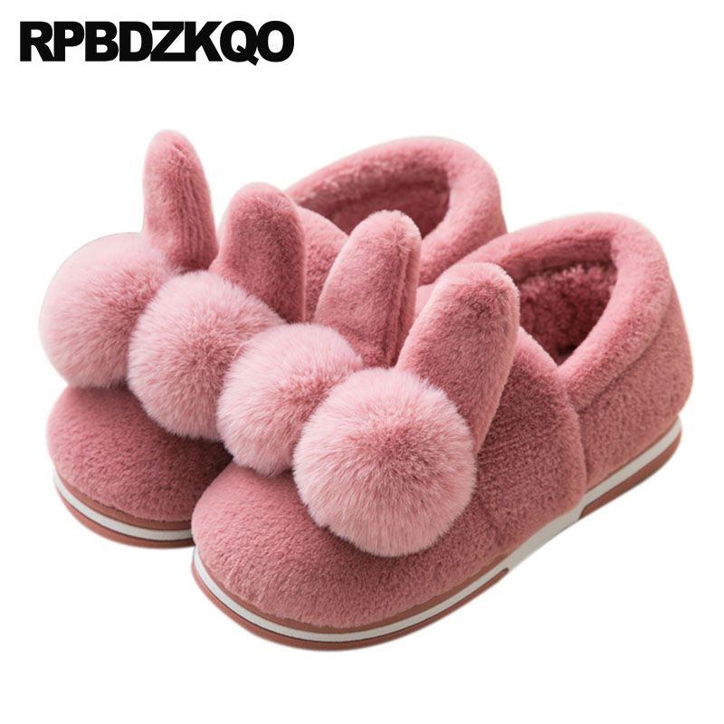 Fuzzy Floor Winter Pom Cute Rabbit Footwear Fluffy House Slip On Fur Bedroom Flatforms Women Plush 43 Wide Fit Shoes Ladies 44