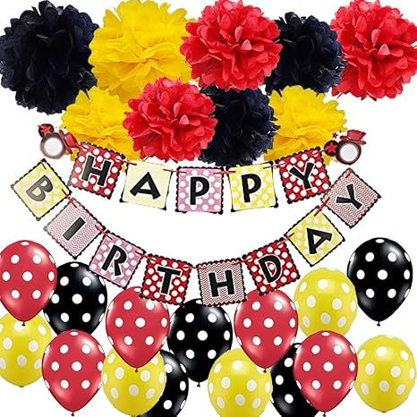 Mickey Mouse Birthday Decorations Happy Birthday Banner Red Yellow Black Tissue Paper Pom Pom Flowers Polka Dot Balloons For Minnie Mouse Party