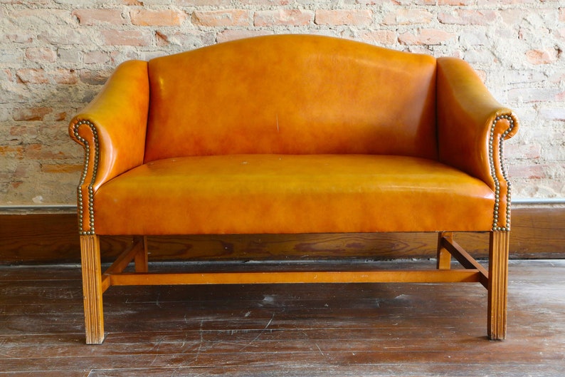 Vintage Orange Sofa Loveseat Couch Studded Arm Chair Chesterfield Sofa Wood Legs 60s Love Seat Hallway Office Bedroom Kitchen Decor Art Deco