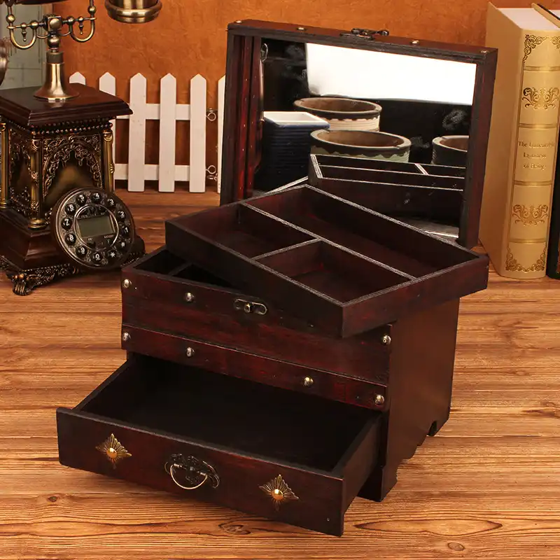 Vintage Large Wooden Jewelry Box With Lock Pattern Toilet Case Desktop Finishing Box Storage Box Princess Storage Box Wooden