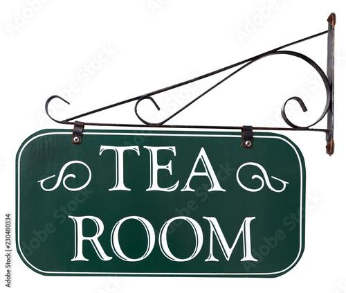 White On Green Tea Room Sign Attached To Metal Bracket Isolated