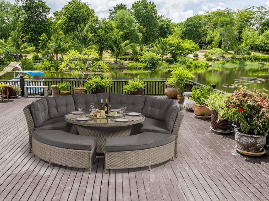 Our comfy cushioned lounge sets will be a conversation piece and make an excellent dining set too with rattan one of our most popular finishes. Have a quiet lunch alone or with family or entertain friends with garden dining sets suited to any garden and any occasion. Whether you have a garden set to lawn a patio or a deck our garden furniture will fit your space.