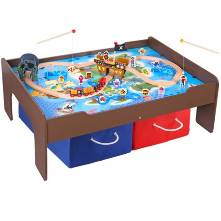 Pidoko Kids Pirate Theme Train Table And Wooden Train Set 72 Pcs Espresso Table With Double Sided Board For Other Activity Play