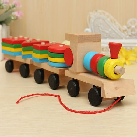 Kids Wooden Toys Stacking Train Blocks Pull Toy Promotes Baby Development Educational Toys For Toddlers With 20 Wooden Shapes And 1 Train Toy