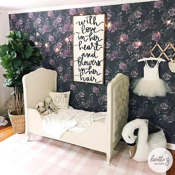 Nursery Dark Floral Wallpaper Girls Room Peony Watercolor Etsy