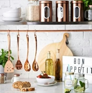 Our handsome kitchen utensils mix metallic with stainless steel heads and gleaming copper clad round handles.