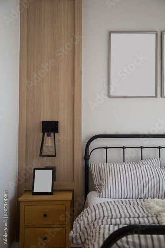 Cozy Bedroom Corner With Natural Wood Headboard And Black Metal Lamp